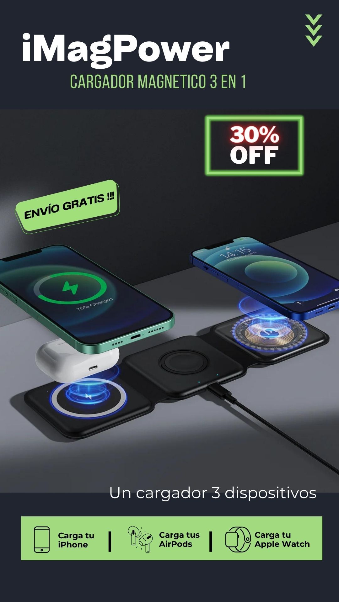 Carga tu iPhone, Apple Watch y AirPods al mismo tiempo, ahorrando tiempo y espacio
